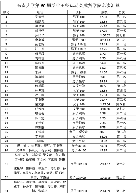 在4月14日结束的桃子视频 第六十届学生田径运动会中,我院运动健儿团结协作、奋勇拼搏,获得男女团体总分第二名,男子团体总分第二名,女子团体总分第二名的好成绩(获奖名单附后)。在此,特向全院师生报喜,并向全体获奖运动员表示热烈的祝贺!