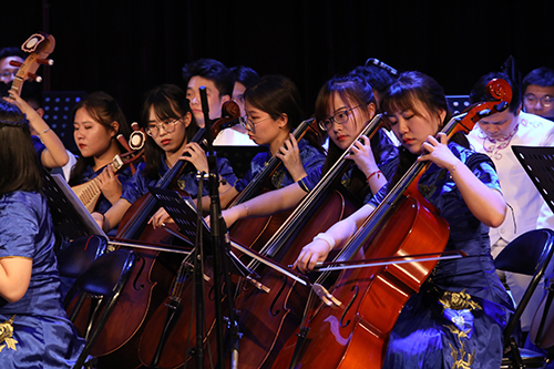 当晚演出在《庆典序曲》中拉开序幕,乐曲热烈欢快,展现出一派盛世祥和;《二月兰畅想曲》节奏欢快,表现了乐团学生们对母校对二月兰、对民乐团的热爱之情;古筝独奏《权御天下》和二胡齐奏《新赛马》节奏酷炫、气势磅礴,尤其是二胡的旋律表现的惟妙惟肖,群马嘶鸣声中,旋律粗狂奔放;国乐交响诗《风狮爷传奇》、弹拨乐合奏《姑苏情》分别表现了金门和江南水乡的地域特色和人文情怀,旋律相互呼应、层层递进;民族管弦乐《印象国乐▪典》《龙腾虎跃》分别表现了大国威武之势和山西民乐特色,场面热闹、效果震撼,给人龙虎腾飞之感;整场演出在大家耳熟能详的86版《西游记》主题曲《云宫迅音》的演奏中完美结束。演出中,南理工姚军教授结合演出曲目详细解析并与学生提问互动,其幽默风趣的主持风格和乐队的精彩演出使现场掌声迭起。