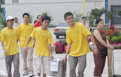 学院团委召开了迎新工作志愿者动员大会,由2004级同学组成的160人迎新工作志愿者队伍,积极热情地活跃在整个新生接待的各个环节。他们耐心地回复家长的咨询,热情地接送新生的行李,宿舍组的同学搬着一件件行李,忙碌于一楼与六楼之间,有的同学手都磨破了仍然坚持工作。在火车站负责接待工作的同学和在校内组织指挥交通的同学,冒着凉风冷雨坚守在自己的岗位上。整个迎新接待工作井然有序,给前来报到的1400多名新生和家长留下了深刻印象,受到一致好评。