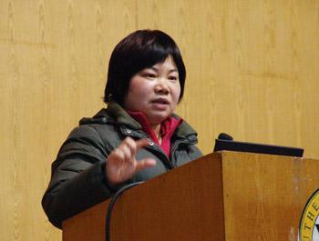 电子工程系主任路兆梅在会上汇报小组讨论情况 土木工程系主任蓝宗建在会上汇报小组讨论情况