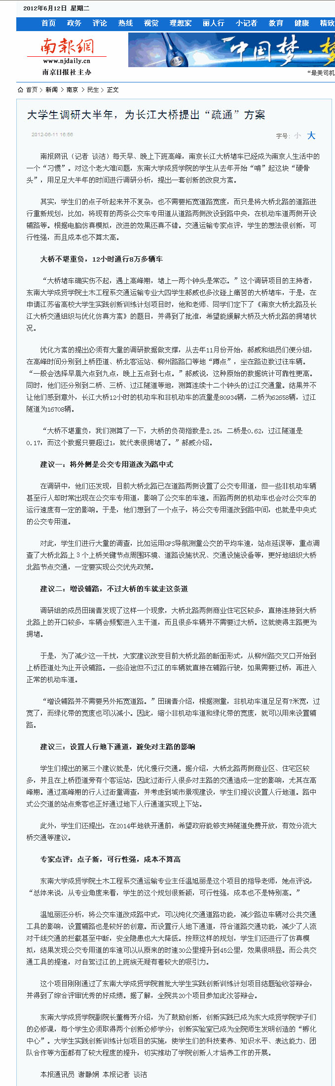 【南报网】大学生调研大半年,为长江大桥提出“疏通”方案