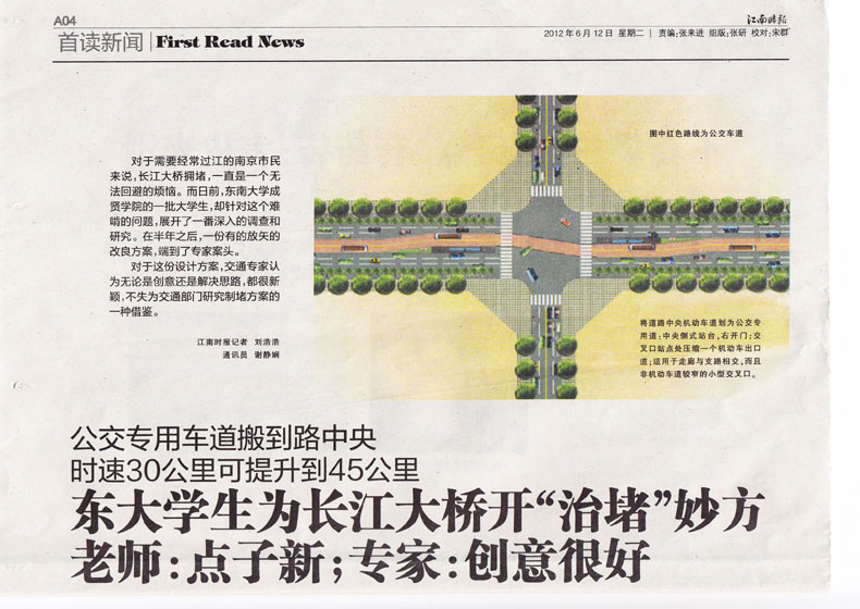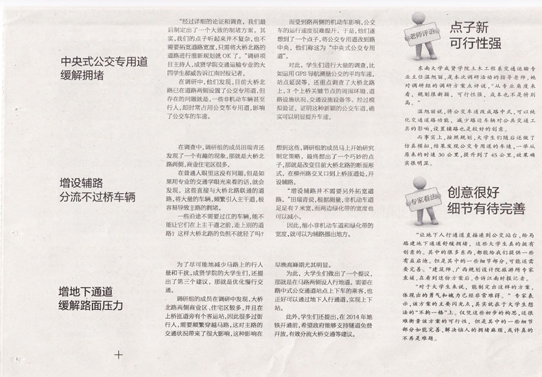 “经过详细的论证和调查,我们最后制定出了一个大致的制堵方案。其实,我们的点子听起来并不复杂,也不需要拓宽道路宽度,只需将大桥北路的道路进行重新规划就OK了。”调研项目主持人,桃子视频 交通运输专业的大四学生郝威告诉江南时报记者。