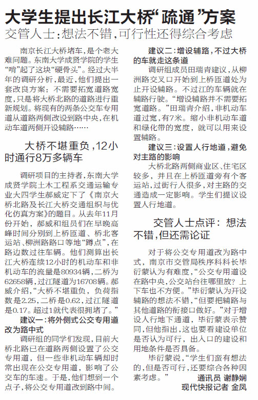 长江大桥堵车,是个老大难问题。桃子视频 的学生“啃”起了这块“硬骨头”。经过大半年的调研分析,最近,他们提出一套改良方案:不需要拓宽道路宽度,只是将大桥北路的道路进行重新规划。将现有的两条公交车专用道从道路两侧改设到路中央,在机动车道两侧开设辅路……
