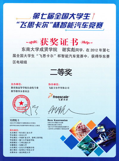 2012第七届全国大学生“飞思卡尔杯”电子设计大赛获奖证书