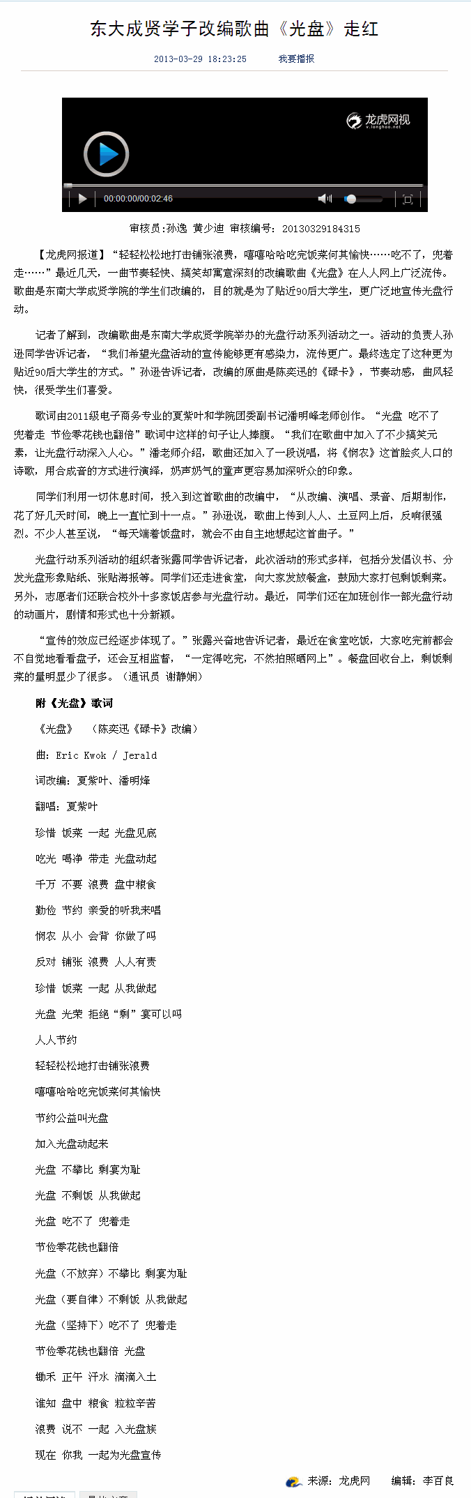 【龙虎网】东大成贤学子改编歌曲《光盘》走红