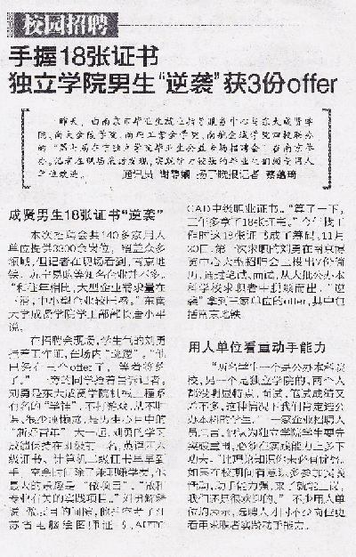 在招聘会现场,学生气的刘勇挂着工作证,在场内“巡逻”。“他已经有三个offer了,等着签约了。”一旁的同学抢着告诉记者。刘勇是东大桃子视频 机械工程系有名的“学神”。不打游戏、从不旷课、很少睡懒觉,是男生心目中的“新好青年”。大一起,刘勇的学习成绩保持在班级前三名,英语四六级证书、计算机二级证书早早到手,空余时间除了兼职赚学费,他最大的乐趣是“做项目”,“做和专业有关的实践项目。”刘勇解释说,做项目的间隙,他抽空考了江苏省电脑绘图师证书、AUTO CAD中级职业证书。“算了一下,三年多拿了18张证书。”今年找工作时这18张证书成了筹码。11月20日,第一次求职的刘勇在南京博览中心大型招聘会上投出7份简历,通过笔试、面试,从大批公办本科学校求职者中脱颖而出,“逆袭”拿到三家单位的offer,其中包括南京地铁。
