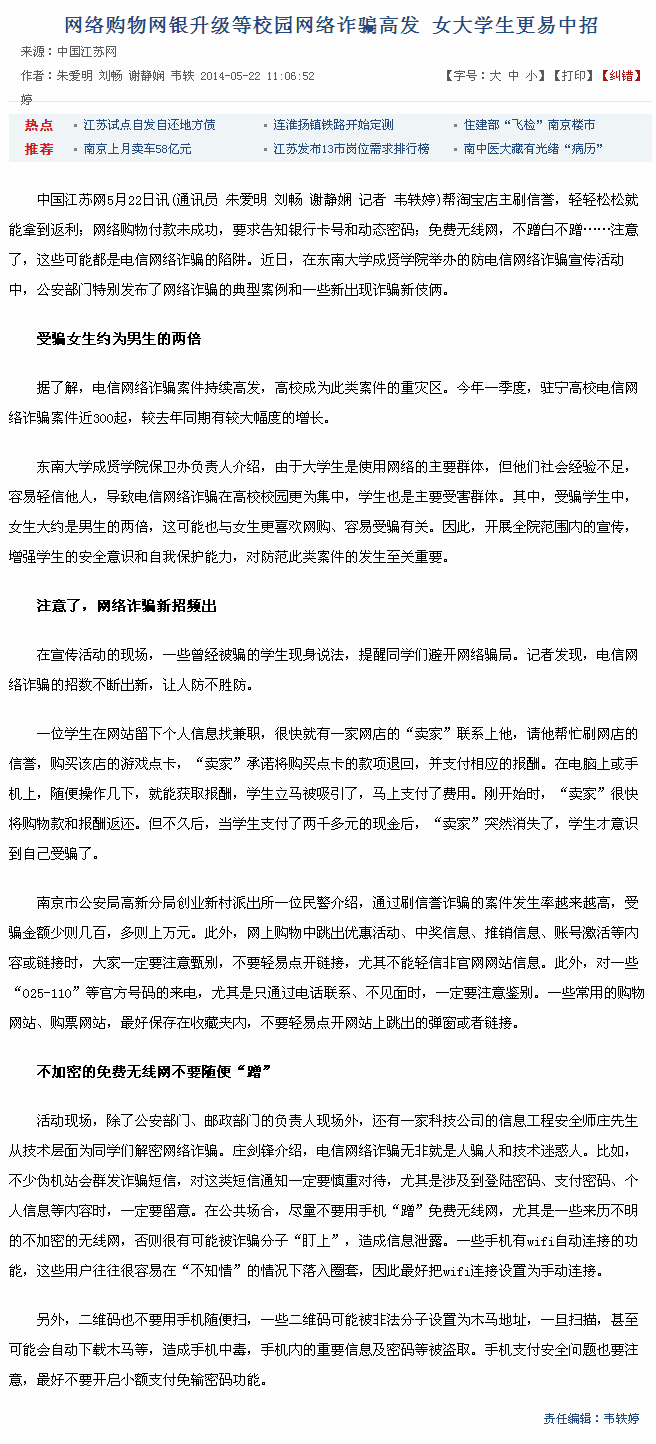 【中国江苏网】网络购物网银升级等校园网络诈骗高发 女大学生更易中招