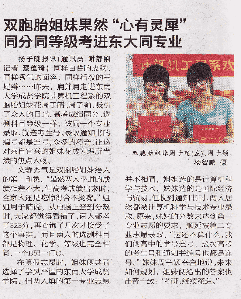 【扬子晚报】双胞胎姐妹果然“心有灵犀” 同分同等级考进东大同专业