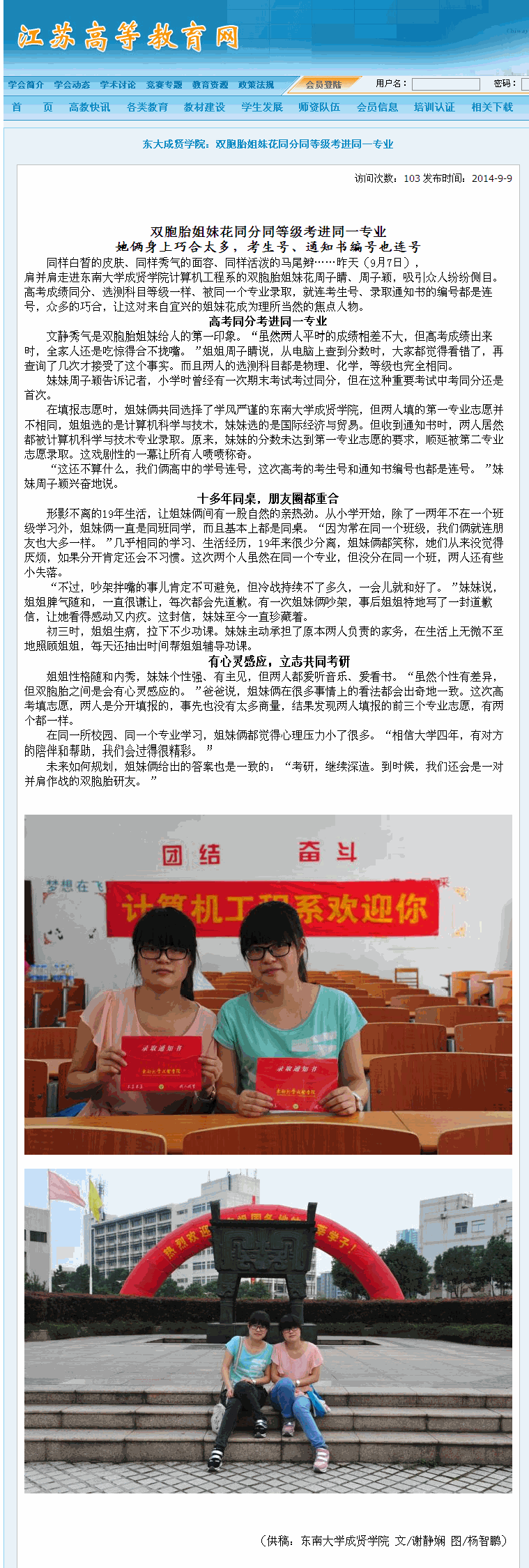 【江苏高等教育网】东大桃子视频 :双胞胎姐妹花同分同等级考进同一专业