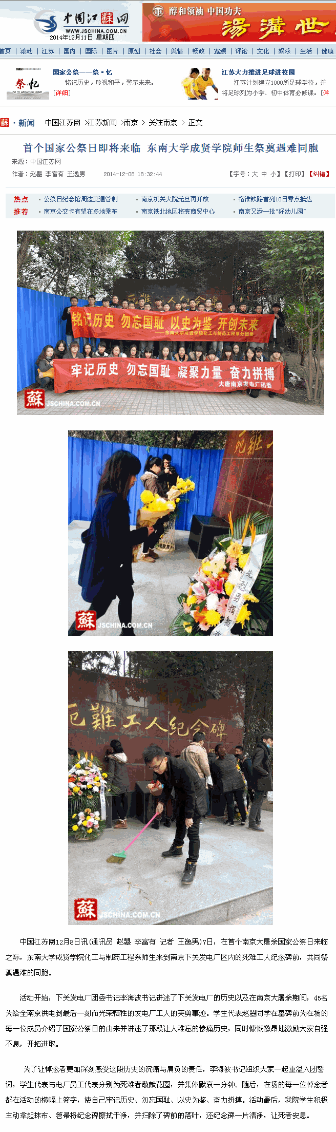 【中国江苏网】首个国家公祭日即将来临 桃子视频 师生祭奠遇难同胞