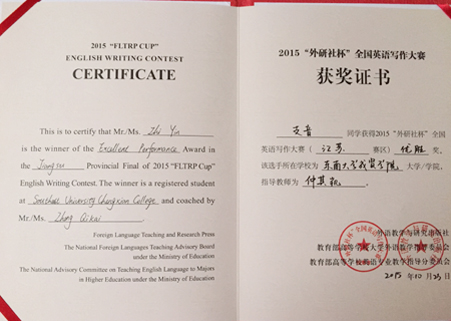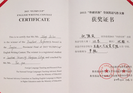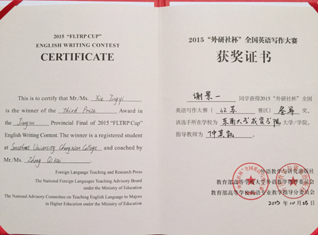 在英语写作大赛江苏赛区决赛中,我院2015级电子信息1班的谢景一同学(指导教师:仲其凯)获江苏赛区三等奖,2014级电子信息1班的张德岚同学(指导教师:严艳)和2015级会计1班的支音同学(指导教师:仲其凯)获江苏赛区优胜奖。