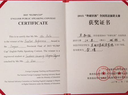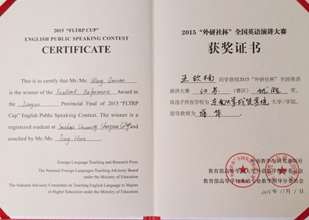 在英语演讲大赛江苏赛区决赛中,来自全省70所本科院校的151位学生参加了比赛,我院2014级药事管理2班的吴家陆同学(指导教师:李倩)和2015级财务管理2班的王钦楠同学(指导教师:蒋华)均获得了江苏赛区优胜奖。