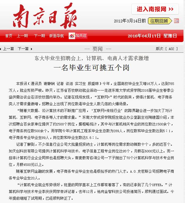 【南京日报】东大毕业生招聘会上,计算机、电商人才需求激增