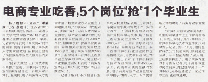 【扬子晚报】校园招聘电商专业吃香 5个岗位“抢”1个毕业生