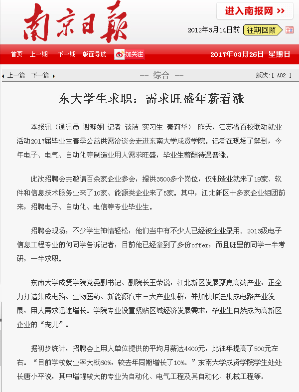 【南京日报】东大学生求职:需求旺盛年薪看涨