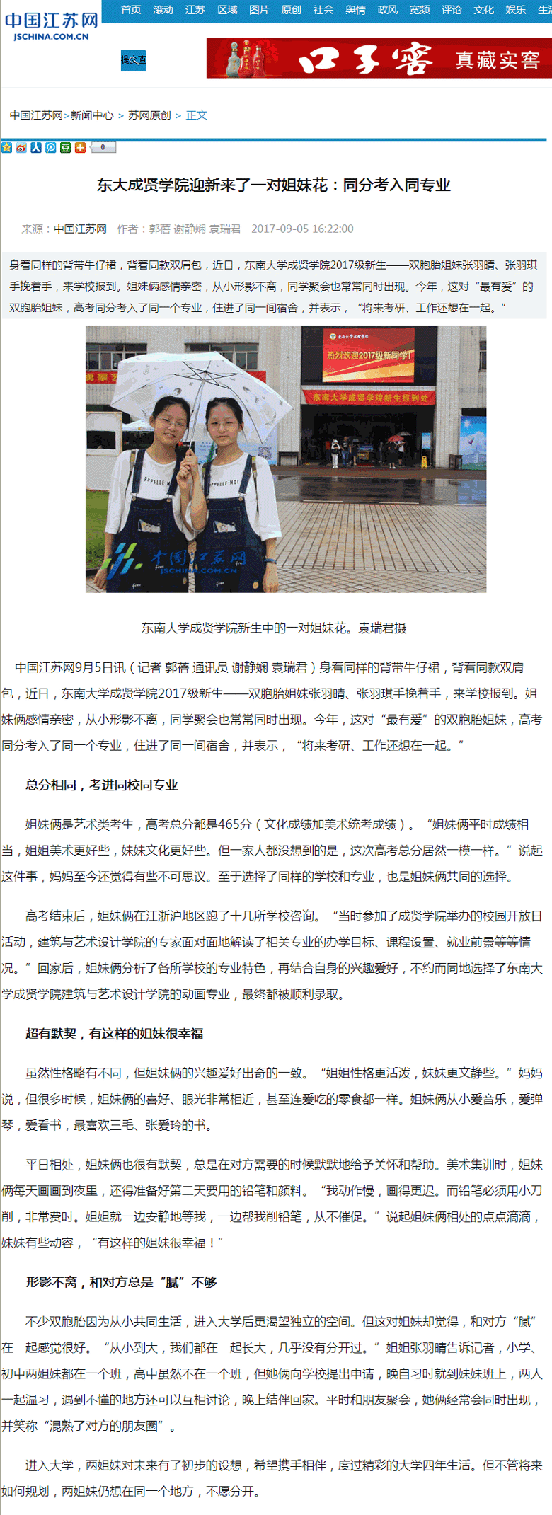 【中国江苏网】东大桃子视频 迎新来了一对姐妹花:同分考入同专业