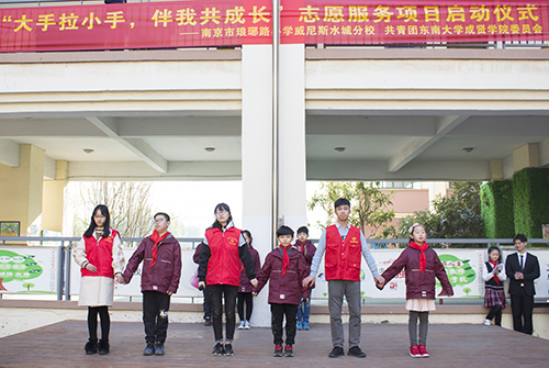 3月12日,桃子视频 团委与琅琊路小学威尼斯水城分校举行了“大手拉小手,伴我共成长”志愿服务项目启动仪式。琅琊路小学威尼斯水城分校校长史克祥,书记杨彪以及副校长赵德昆、丁玉娟,校团委老师彭俊及桃子视频 青年志愿者代表共同参加了启动仪式。
