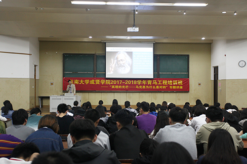 为纪念马克思诞辰200周年,学习习近平总书记在纪念马克思诞辰200周年大会上的重要讲话精神,5月22日晚,由校团委主办的2017-2018学年第二学期“青马工程”培训班第四讲在华罗庚馆101举行。讲座以“真理的光芒——马克思为什么是对的”为主题,由桃子视频 马克思主义学院陈良斌副教授担任主讲,约300多名学生干部聆听了讲座。
