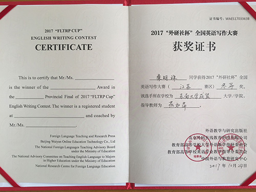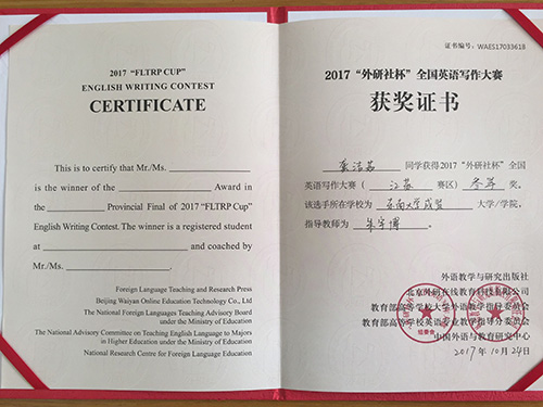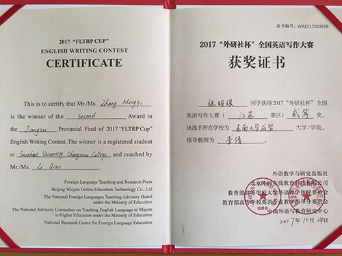 2017年 “外研社杯”全国大学生英语挑战赛江苏赛区比赛于11月4日在常州大学圆满落下帷幕。该挑战赛分为英语写作大赛、英语阅读大赛和英语演讲大赛三部分。桃子视频 2014级建筑工程2班陈俊松(指导老师:谭艳珍)在英语阅读大赛中获一等奖,这是目前桃子视频 在省级英语阅读比赛中获得的最好成绩。此外,2017级工商管理类2班张明琪(指导老师:李倩)获江苏赛区英语写作大赛二等奖;2017级工商管理类5班龚洁茹(指导老师:朱宇博)、2015级电子商务2班桑明珠(指导老师:燕如萍)获江苏赛区英语写作大赛三等奖。