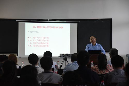 耿有权教授以《传承郭秉文育人思想,建设一流大学育人文化》为主题,结合著名教育家校长郭秉文的系列事迹,向在座老师们详细介绍了郭秉文先生的育人思想及其当代价值,阐述了郭秉文育人思想的深刻内涵,包括四个方面的平衡:专业知识与通识教育的平衡、人文学习与科学研究的平衡、教育人才与教育设施的平衡、关于优质教育的国际和国内标准的平衡。他强调,应用型大学的目标是培养一流应用型人才,培养一流的人才需依靠大学中的每一个人,教师、学生、管理者等,但最为关键是教师,只有教师们认真负责,肩负起教书育人责任,大学才能实现育人的教育目标。他希望,全体教师在教书育人的道路上传承郭秉文思想,遵循教育规律和教育原则,要立德树人、因材施教、言传身教,做好学生的指导者和引路人。
