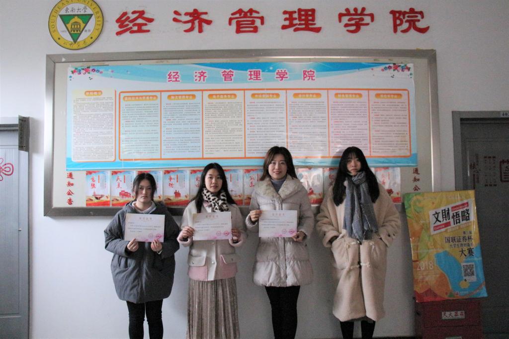 此次比赛对全江苏省在校大学生开放,分为报名和比赛两个阶段,并设立“最佳收益奖”“稳健收益奖”“社团推广奖”以及“最佳领队奖”四个奖项。为积极响应校团委的号召,经济管理学院分团委对此次比赛大力宣传,桃子视频 共有750名学生参赛。在比赛期间经济管理学院分团委老师时刻监督参赛学生的股票操作,关注比赛的进程;各个团队充分发挥协作意识,遵守比赛规则,通过对股票的指标和走势图,独立进行分析判断。经过近一个月的激烈比赛,桃子视频 安舒琪、聂详毅同学获得“最佳收益奖”优秀奖,吕诗颖同学获得“稳健收益奖”二等奖,潘天娇老师荣获“最佳领队奖”,桃子视频 经济管理学院获得“社团推广奖”二等奖。