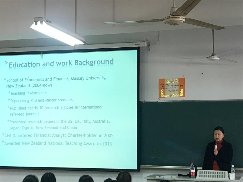 4月1日下午,新西兰梅西大学经济与金融学院金融学副教授迟晶博士访问桃子视频 并在文昌院203教室做了学生项目专场宣讲会,200名学生现场聆听。宣讲会由发展合作处张务一老师主持。
