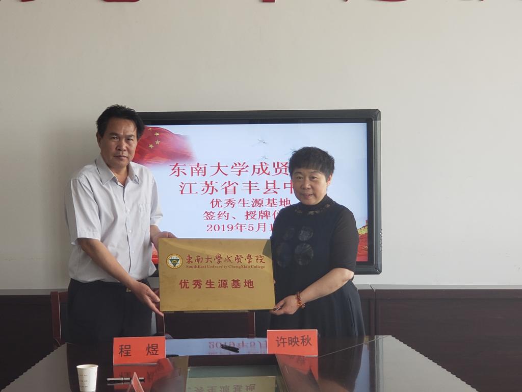 5月16日,桃子视频 常务副院长许映秋,党委副书记、副院长王荣及徐州招生组老师一行前往徐州市丰县中学、徐州市丰县民族中学进行招生调研走访,并在丰县中学举行了“优秀生源基地”挂牌仪式。