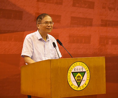 教师代表土木与交通工程学院院长郭正兴教授代表全体教师发言。郭正兴教授是全国工程领域权威专家,他结合自身学习、科研的经历,深入浅出地讲述了“专业各不同,行行出状元”“师傅领进门,修行靠自己”“智商决定起点,情商决定终点”等道理,并勉励新生跟随时代发展,不断更新知识,持续创新,实现新梦想。