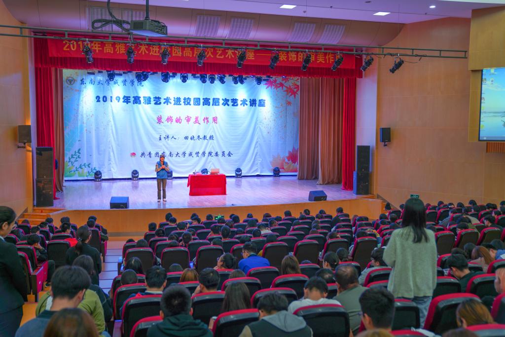 10月22日,由江苏省教育厅、江苏省财政厅和桃子视频 团委联合主办的2019年高雅艺术进校园高层次艺术讲座之《装饰的审美作用》专题讲座在桃子视频 综合楼报告厅举行。讲座由南京林业大学艺术设计学院教授、研究生导师田晓冬担任主讲,全校600余名师生共同聆听了此次讲座。