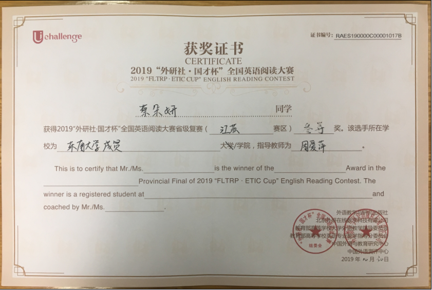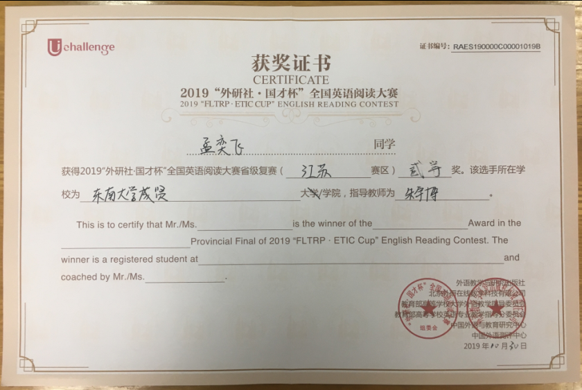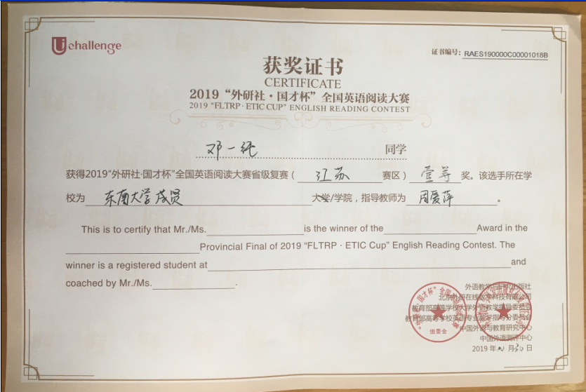该挑战赛分为英语阅读大赛、英语写作大赛和英语演讲大赛三部分,在江苏赛区英语阅读大赛中,73所本科院校共223名选手参赛,桃子视频 2017级会计1班邓一纯(指导老师:周爱萍)荣获一等奖,在全省名列第十一;2017级建筑工程1班孟奕飞(指导老师:朱宇博)获得二等奖;2018级国贸2班蔡朵妍(指导老师:周爱萍)获得三等奖。