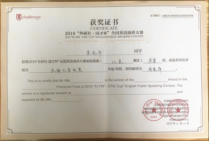 来自约70所本科院校166名学生参加江苏赛区高难度的演讲大赛,2018级计算机4班朱光年(指导老师:周爱萍)获得三等奖,这是桃子视频 在省级该类比赛中获得的最好成绩;2016级风景园林2班林大敏(指导老师:姜丽)获优胜奖。