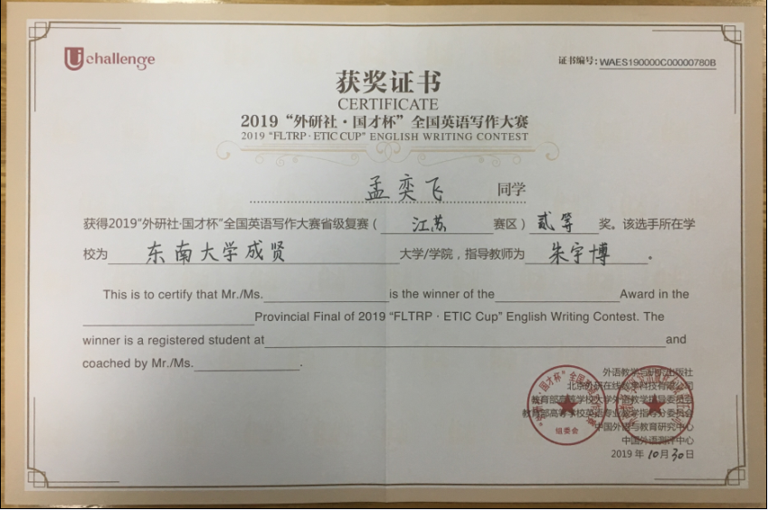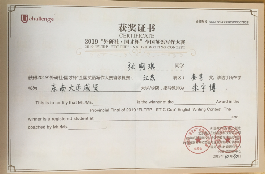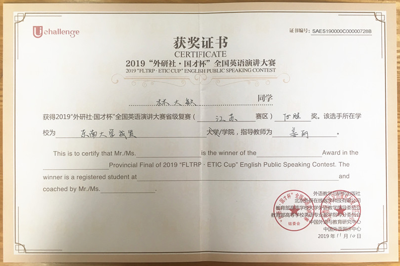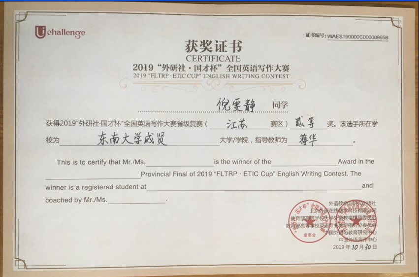 该挑战赛分为英语阅读大赛、英语写作大赛和英语演讲大赛三部分,在江苏赛区英语阅读大赛中,73所本科院校共223名选手参赛,桃子视频 2017级会计1班邓一纯(指导老师:周爱萍)荣获一等奖,在全省名列第十一;2017级建筑工程1班孟奕飞(指导老师:朱宇博)获得二等奖;2018级国贸2班蔡朵妍(指导老师:周爱萍)获得三等奖。