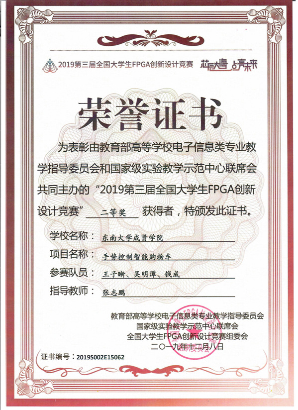 总决赛于12月6日至12月8日在南京江北新区ICisC人才实训基地举办。桃子视频 电子与计算机工程学院张志鹏老师指导的多个项目组进入全国总决赛,最终“我去深海捞板子”团队王子晰、吴明潭、钱成制作的《手势遥控智能购物机器人》获得“全国二等奖”,该项目同时获得上海安路信息科技有限公司“企业特别奖”。