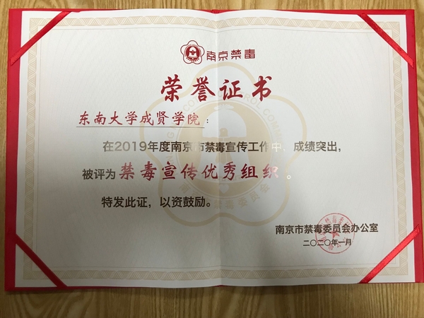2020年1月5日,2019南京禁毒宣传工作总结会在南京师范大学仙林校区音乐厅召开。省禁毒办常务副主任、省公安厅禁毒总队总队长张波,市局党委委员、市禁毒委副主任曹存福,市禁毒办副主任、市公安局禁毒支队支队长仲军,市教育局宣传与德育工作处处长完进、市公安局禁毒支队副支队长刘庆峰、团市委副调研员陶涛以及各地区高校禁毒志愿者们参加了本次禁毒宣传工作总结表彰会。桃子视频 青年志愿者协会因2019年在禁毒宣传工作上表现突出,被评为“禁毒宣传优秀组织”,桃子视频 叶昕怡同学被评为“优秀志愿者”。