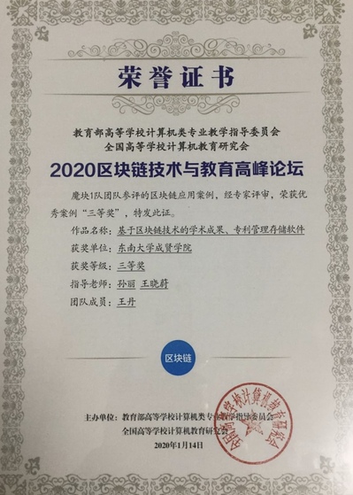 作为我国核心技术自主创新的重要突破口之一,区块链承载着我国在新兴领域占据创新制高点、取得产业新优势的期待。本次论坛由教育部高等学校计算机类专业教学指导委员会、全国高等学校计算机教育研究会主办。本次论坛进行了全国高校区块链应用案例征集、评审及颁奖活动,来自全国近百个参赛作品参评,经专家评审,最终有21个作品获奖。桃子视频 电子与计算机工程学院参赛作品“基于区块链技术的学术成果、专利管理存储软件”荣获2019年全国高校区块链应用案例征集优秀案例三等奖。