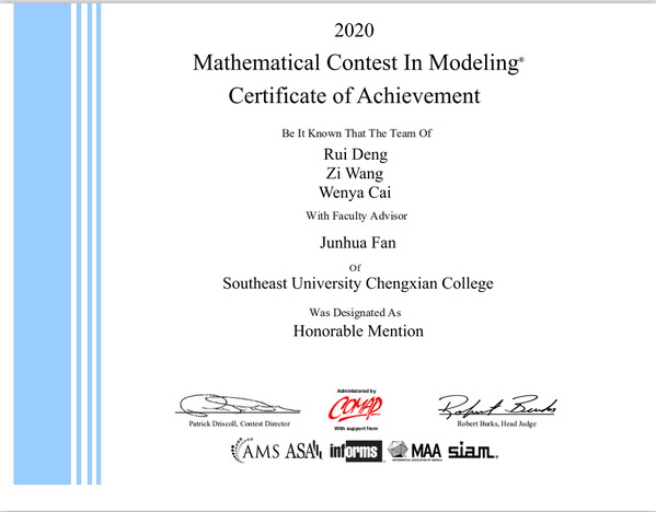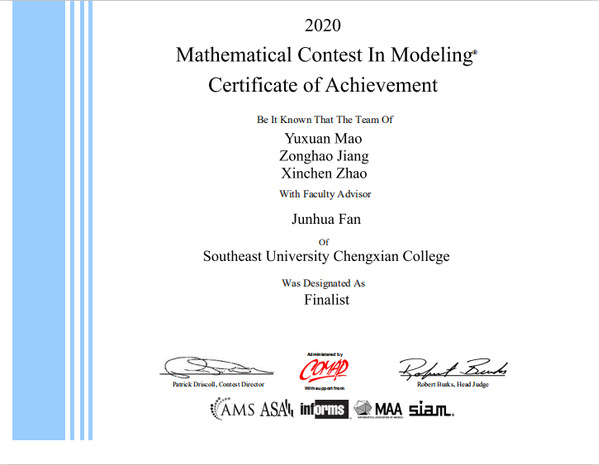 美国大学生数学建模竞赛由美国数学及其应用联合会主办,是唯一的国际性数学建模竞赛。竞赛的评审十分严格,获奖的参赛队伍都是在综合数学科学基础、英文表达能力、科研论文写作、计算机仿真能力和应用创新能力等方面激烈竞争中胜出的佼佼者。该竞赛每年都会吸引来自世界数十个国家和地区的数千只高校队伍参赛。今年有来自1448所院校的20948队大学生参加,共评出特等奖37项(0.18%),特等奖提名奖414项(2%),一等奖1403项(6.7%),二等奖5087项(24.2%)。受全球疫情的影响,美国数学及应用联合会举办方将2020年的美赛分为两个参赛时间。第一个参赛时间为2月13日到17日,第二个参赛时间为3月5日到9日。基础部数学组范俊花老师负责组织并培训指导来自各个院系的3个团队参加了比赛。