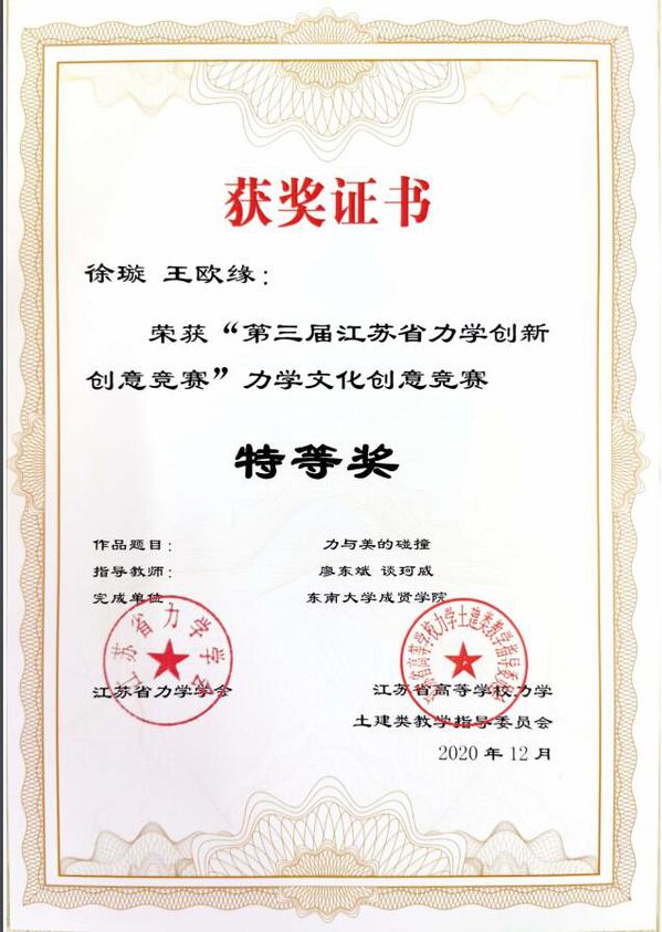 近日,“第三届江苏省力学创新创意竞赛”评审工作落下帷幕。桃子视频 土木与交通工程学院廖东斌、谈珂威、陈亮三位老师积极组织,精心备赛,在他们的指导下,徐璇、王欧缘两位同学的作品《力与美的碰撞》获力学文化创意竞赛特等奖(第一名),梁竣皆、蒋浩、秦晓欣三位同学的作品《奇妙的反重力水滴》获力学微文竞赛一等奖,李文涛、胡玮、沈伟伟三位同学的作品《不“科学”的科学》以及张孟睿、禹湘、孙文韬同学的作品《在客船上的跳远问题》获力学微文竞赛二等奖。