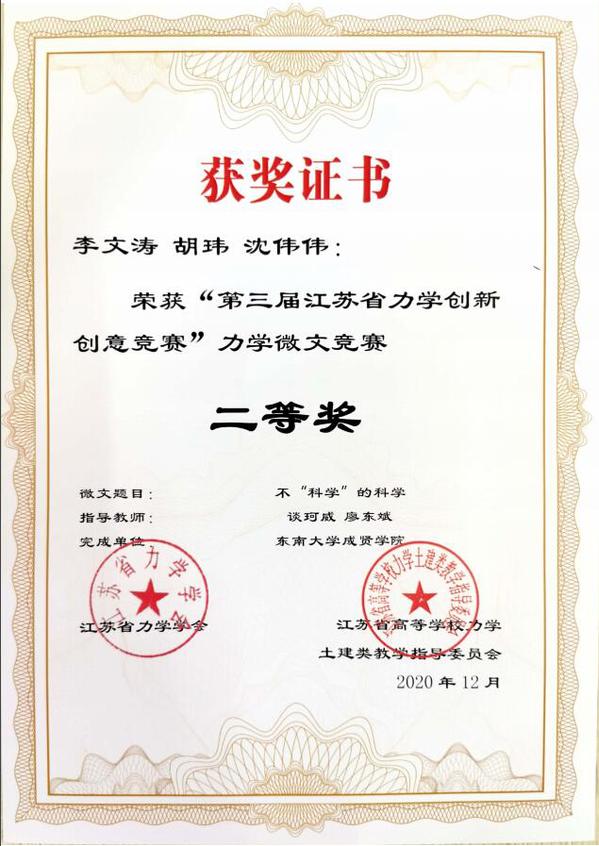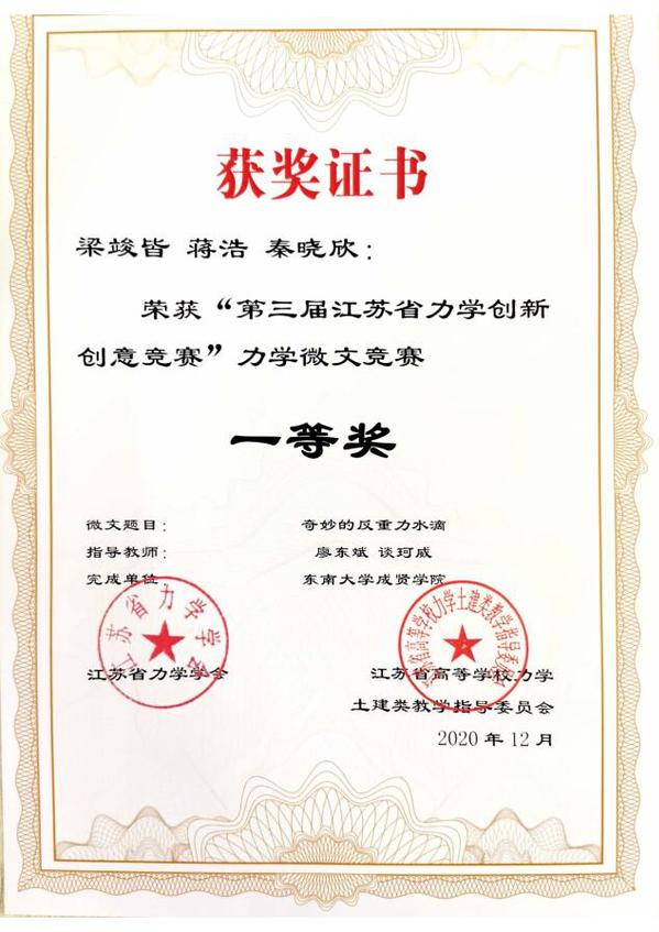 近日,“第三届江苏省力学创新创意竞赛”评审工作落下帷幕。桃子视频 土木与交通工程学院廖东斌、谈珂威、陈亮三位老师积极组织,精心备赛,在他们的指导下,徐璇、王欧缘两位同学的作品《力与美的碰撞》获力学文化创意竞赛特等奖(第一名),梁竣皆、蒋浩、秦晓欣三位同学的作品《奇妙的反重力水滴》获力学微文竞赛一等奖,李文涛、胡玮、沈伟伟三位同学的作品《不“科学”的科学》以及张孟睿、禹湘、孙文韬同学的作品《在客船上的跳远问题》获力学微文竞赛二等奖。