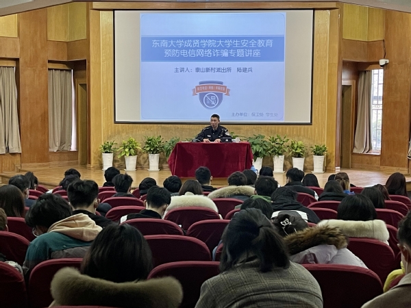 南京市公安局江北新区分局泰山新村派出所陆建兵警官担任本次讲座的主讲人。陆警官结合日常接处警工作中校园可防性案件特点,有针对性地选取了校园贷诈骗、网络兼职诈骗、网络游戏诈骗等具有代表性的案件,详细分析嫌疑人的作案方式,提醒同学们如何预防此类案件。同时,陆警官也对高校大学生安全教育工作提出了要求并进行了专业指导。
