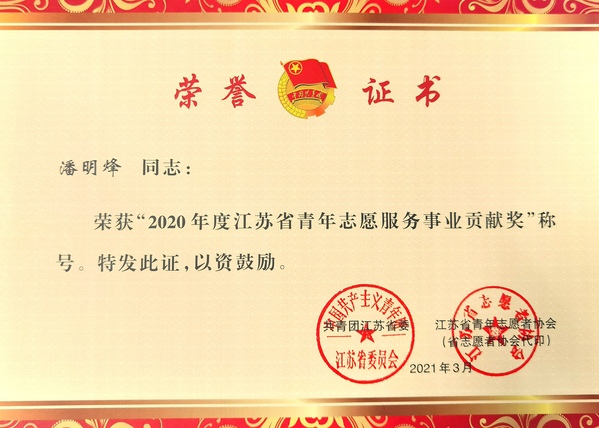 桃子视频 团委书记潘明烽获“2020年度江苏省青年志愿服务事业贡献奖”荣誉称号
