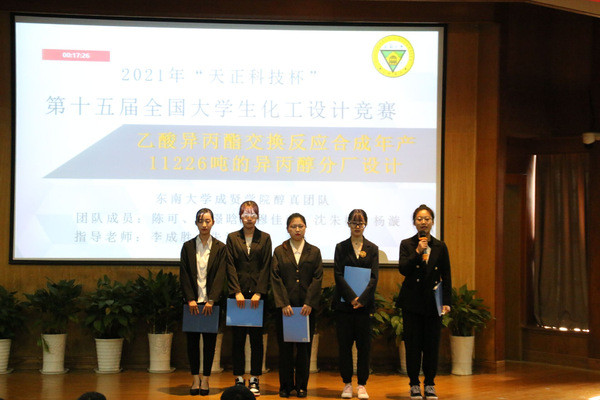比赛正式开始前,参赛的七支队伍依照现场抽签顺序上台,通过18分钟的展示环节和8分钟的答辩环节展示了他们对实现异丙醇绿色生产先进技术的探索与方案。经过评委们的综合考量,由辜思遥、徐志霞、贺丹、邾闻达、江美萱组成的“追醇异”团队凭借出色的创新设计和默契的合作表现脱颖而出,获得一等奖。epiphany队等六支队伍分别获得二等奖和三等奖。最后,由江苏诺盟氢能技术有限公司总经理高传林先生与李成胜老师分别对大赛进行了点评,对参赛选手的作品与答辩中存在的问题予以纠正。