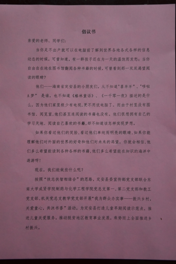 活动前期,制药与化学工程学院党总支面向全院师生、机关党总支教学党支部面向部门内所有教职工发放了倡议书,进行了广泛的宣传动员,让大家清晰了解当地乡村和儿童阅读的真实情况,充分认识到支部联合开展本次活动的目的和意义。活动开展过程中,师生们积极响应,踊跃捐赠,有些老师在网上购置了很多适合儿童的新图书,有些学生将珍藏多年的系列图书捐赠了出来,短短一周,共收到图书600余册、玩具100多件,每一本书、每一个玩具都凝聚和表达着师生们对乡村儿童们浓浓的情谊和深切的关爱。
