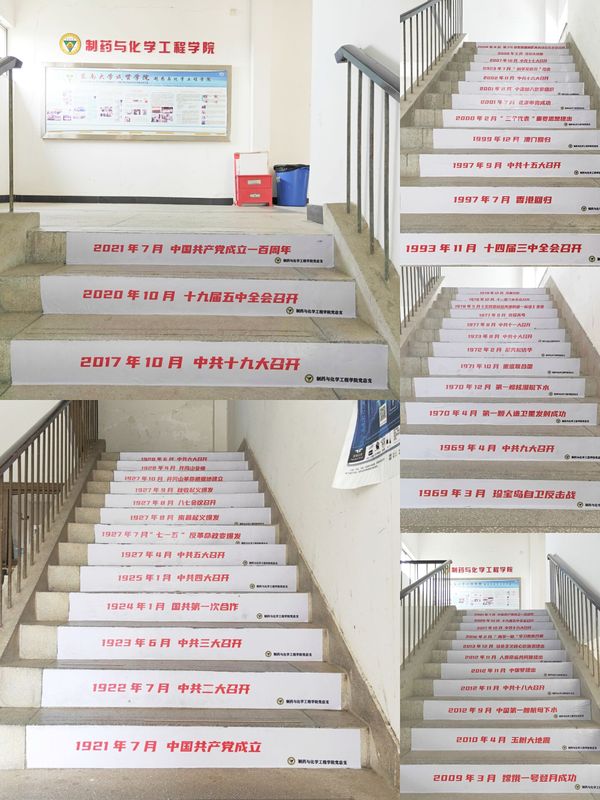 为激励青年学生做到学史明理、学史增信、学史崇德、学史力行,教育引导党员同志学党史、悟思想、办实事、开新局,近期,制药与化学工程学院党总支充分利用现有资源,将党的历史进程中重要的历史事件制作成100张醒目的标语张贴在成贤院一至五楼的100个台阶下部,旨在让广大师生们在日常生活中就能了解“四史”,着力打造沉浸式“四史”学习课堂。一步一台阶,扎扎实实谱新篇。