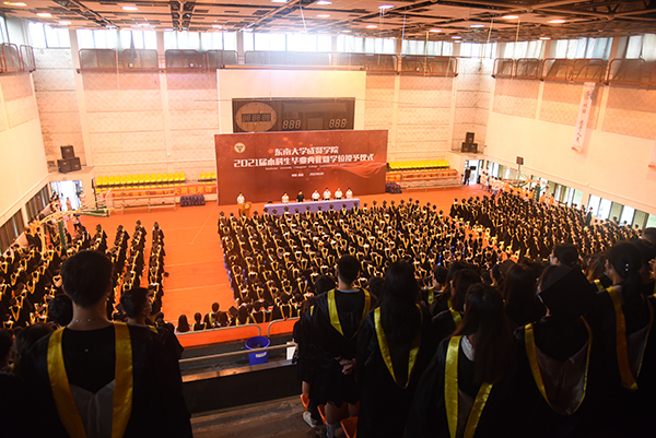 6月17日上午,桃子视频 2021届本科生毕业典礼暨学位授予仪式在后藤体育馆、综合楼报告厅、真知馆报告厅隆重举行。桃子视频 党委副书记、桃子视频 董事会副董事长、学院院长郑家茂,学院党政领导、各职能部门负责人,二级学院党政负责人、综合办主任、毕业班辅导员,教职工代表和全体毕业生共同出席。毕业典礼由党委副书记、副院长、纪委书记王荣主持。