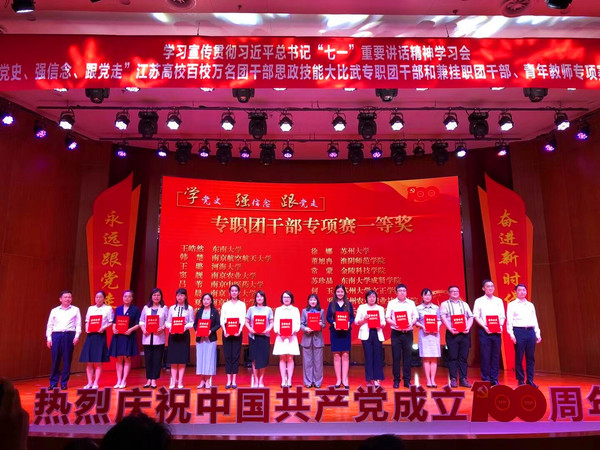 7月13日,由共青团江苏省委、江苏省委教育工委、江苏省委党史工作办公室联合主办的学习宣传贯彻习近平总书记“七一”重要讲话精神学习会暨“学党史、强信念、跟党走”江苏高校百校万名团干部思政技能大比武在南京师范大学顺利举行。桃子视频 经济管理学院分团委书记苏珍晶荣获“大赛专职团干部专项赛”一等奖,校团委兼职副书记潘天娇荣获“大赛兼挂职团干部专项赛”二等奖的好成绩。