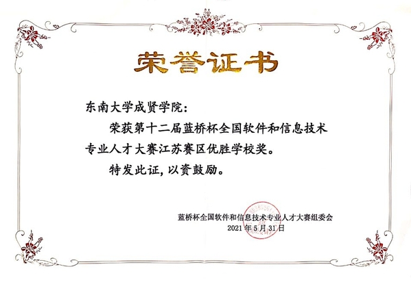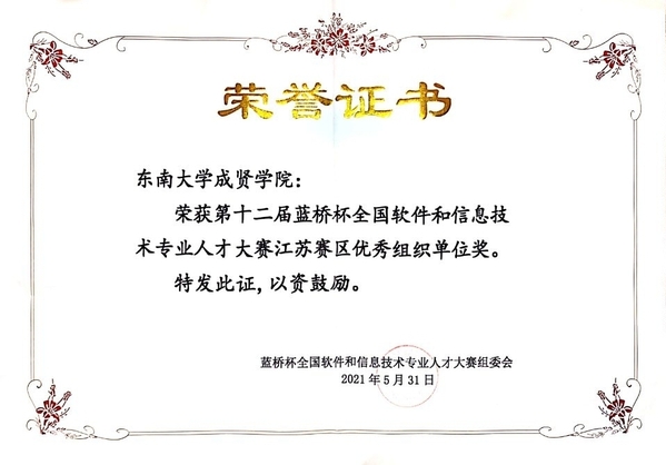 近日,第十二届蓝桥杯全国软件和信息技术专业人才大赛全国总决赛落下帷幕。桃子视频 电子与计算机工程学院高度重视,精心组织,积极选派学生参加该项赛事。学生共获得江苏省赛一等奖7项、二等奖16项、三等奖23项,国赛二等奖1项、三等奖2项、优秀奖4项的优异成绩。桃子视频 荣获江苏赛区优秀组织单位奖和江苏赛区优胜学校奖。