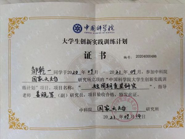 天文是邹乾一的个人爱好,他曾在高中时担任学校天文社副社长。进入大学后,他参加国内第一个从事业余巡天、科研科普结合成果最好的业余天文台——星明天文台从事志愿者工作,并撰写了数十篇科普文为天文科普做出贡献。2020年5月邹乾一同学在申报学校大学生创新实践训练计划的同时,积极申报中国科学院大学生创新实践“短周期变星研究”课题组,怀着不安与激动向课题指导老师、国家天文台兴隆观测基地总工姜晓军研究员发送了申请邮件,详细阐述了自己在星明天文台的工作情况和对天文研究的强烈愿望,经过综合评测后最终被选入课题组。