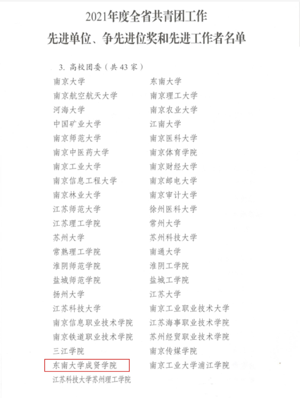 2021年团委获评“2020年度江苏省青年志愿服务行动组织奖”;校青年志愿者协会荣获“2020年度禁毒宣传优秀高校”称号;第十七届“挑战杯”全国大学生课外学术科技作品竞赛红色专项荣获江苏省选拔赛二等奖1个、三等奖2个;第十七届江苏省大学生课外学术科技作品竞赛暨“挑战杯”全国竞赛江苏省选拔赛决赛获二等奖1个、三等奖2个;全省思政技能大比武获一等奖1个、二等奖1个。