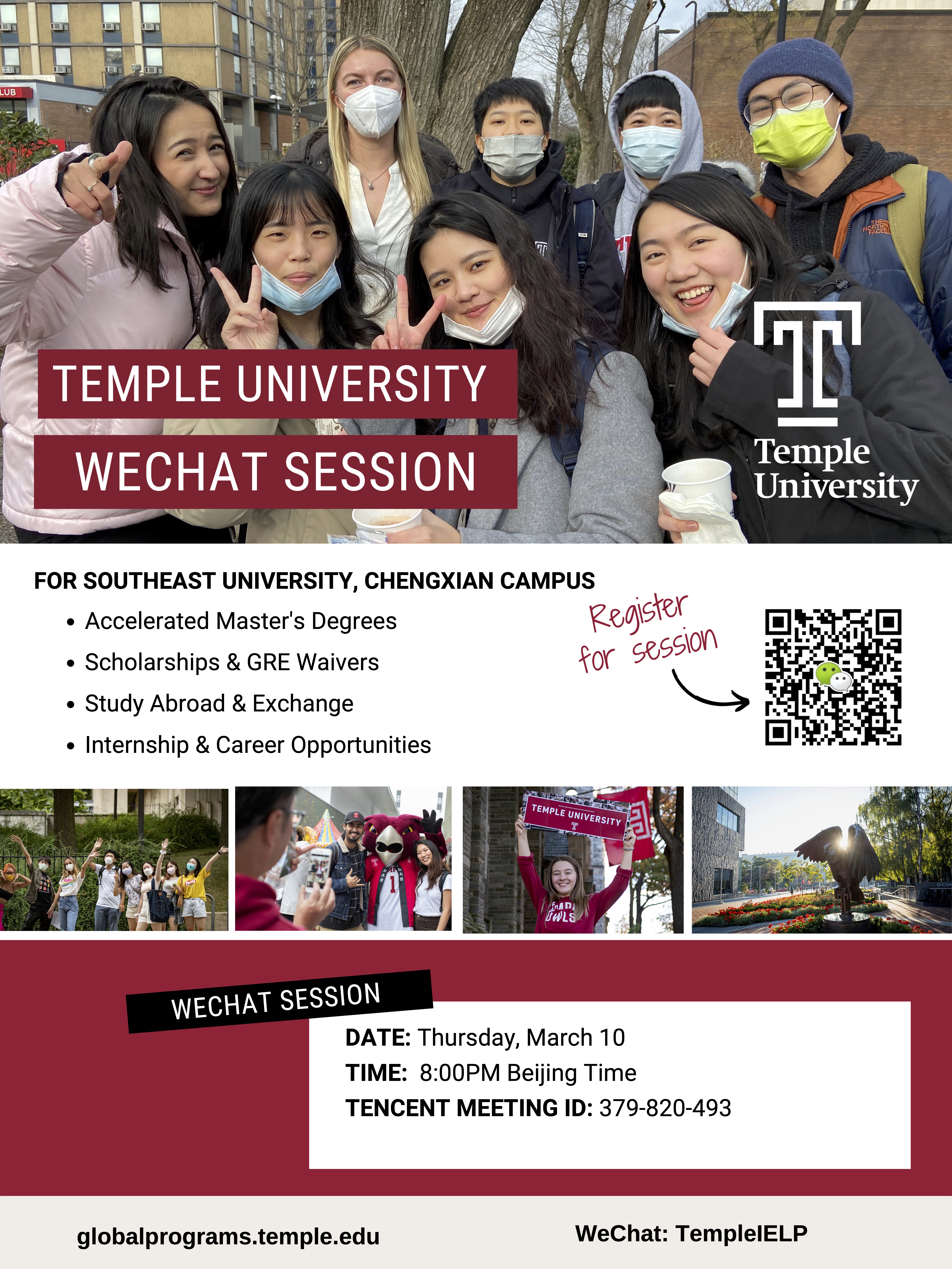 3、参会方式:扫附件1中二维码“天普大学成贤宣讲会群”,正式线上“腾讯”会议,ID为379820493(见附件2“2022年3月10日天普大学成贤宣讲简报”)。