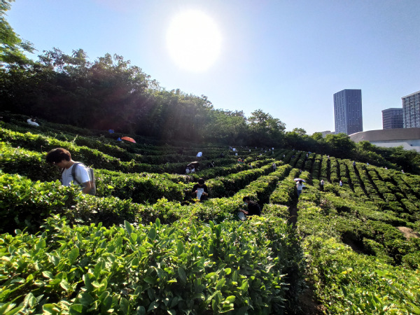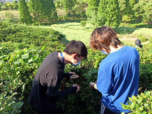 劳动实践现场,指导老师首先向同学们介绍了茶叶采摘的基本手法与要求以及相关安全注意事项,同学们便开始采茶劳动。“一芽一叶”“提手采”“不采蒂头、不采大叶、不采老叶”,在指导老师以及有过采茶经验的同学手把手带领下,大家弯着腰,认真观察、小心采摘,在一个多小时的采茶过程中,从未采摘过茶叶的同学们逐渐由“生手”转变为了“熟手”,看着满袋的茶芽,成就感油然而生。